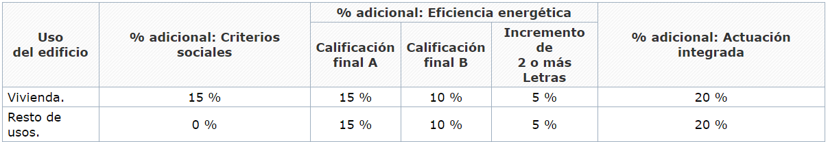 2º Ayuda adicional por criterio social, eficiencia energética o actuación integrada. Se podrá obtener una ayuda adicional a la ayuda base. El cálculo de la ayuda adicional se realizará sumando el porcentaje de cada uno de los tres criterios según corresponda. En el caso del criterio de eficiencia energética solo se podrá aplicar uno de los tres porcentajes, bien calificación energética A, B o incremento de 2 o más letras. Los valores de la ayuda adicional que corresponden a esta tipología de actuación, se indican en el cuadro siguiente, en el que los porcentajes son referidos a la suma de costes elegibles correspondientes a esta tipología de actuación: